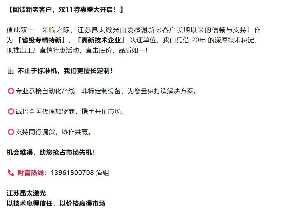 首先,衷心感谢各位对昆太激光的信任与支持!近年来,随着昆太激光打标技术的飞速发展,我们很高兴能通过新媒体平台(如微信公众号、视频号、抖音等)与大家分享最新的技术成果与应用案例。